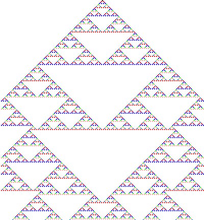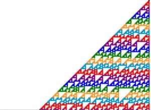 Starting from a single C=1 cell at the top and applying the rules as we step down through the pattern (each line downward corresponds to a new time step) we get the following patterns for rules 90 and 110 when C=1 is a color and C=0 is white.